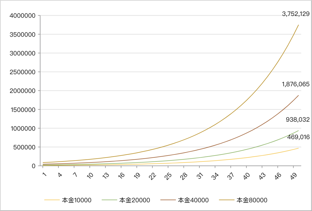 可以用一个简单例子说明:初始本金1万元,年化收益率为8%,每隔十年的资产分别是2.16、4.66、10.06、21.72、46.90万元,每十年内的资产增加值分别是1.16、2.50、5.40、11.62、25.18万元。
