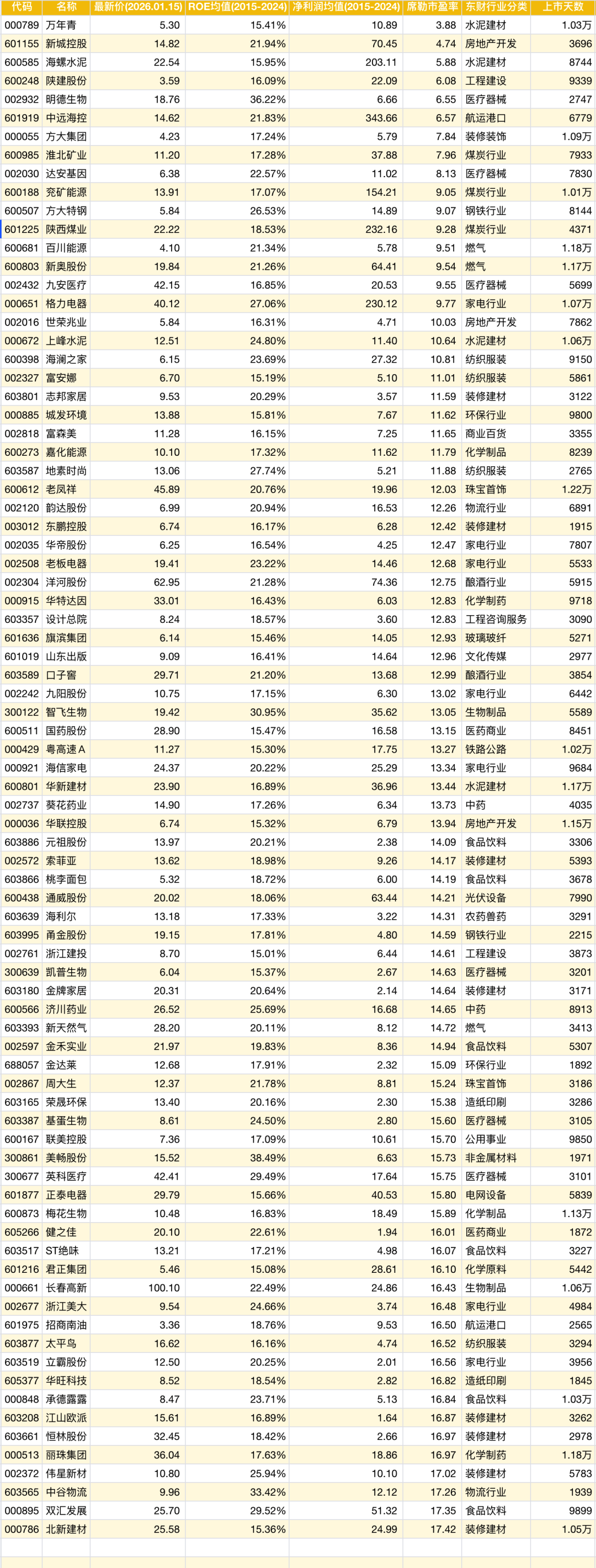选股条件:非银行股;非保险股;非证券股;非农牧饲渔股;上市天数大于5年;席勒市盈率介于0-17.5之间;十年ROE的平均值大于15%;
