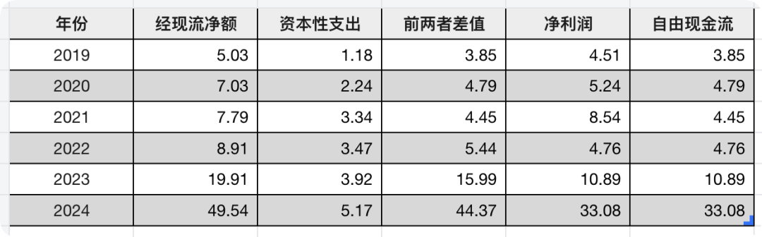 通过上述方法,泡泡玛特在2020~2024年间的自由现金流如下表所示:2022年后,自由现金流与净利润一致,况且资本性支出带来了净利润的持续增长,所以简便起见,我们可以把泡泡玛特的净利润当做自由现金流。