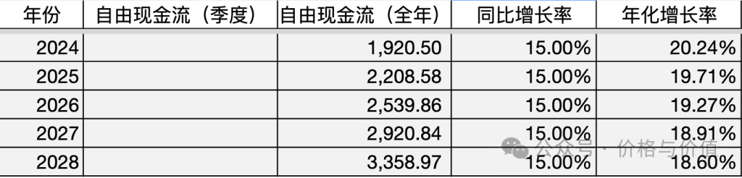 以2023年为基点,则2024~2028年的自由现金流预测值(单位:亿元)如下所示: