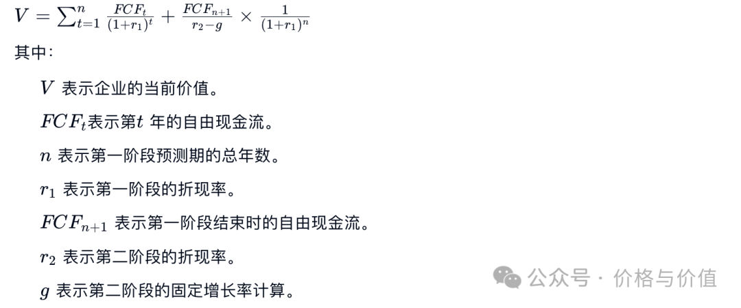 由于腾讯控股目前仍然处于高速增长的成长期,因此我们使用两段式自由现金流折现估值法来计算其当前的内在价值。