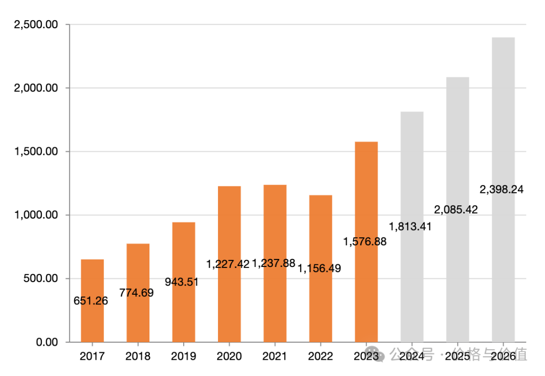 - 2017~2023年:15.88%=(1576.88÷651.26)^(1÷6)-1