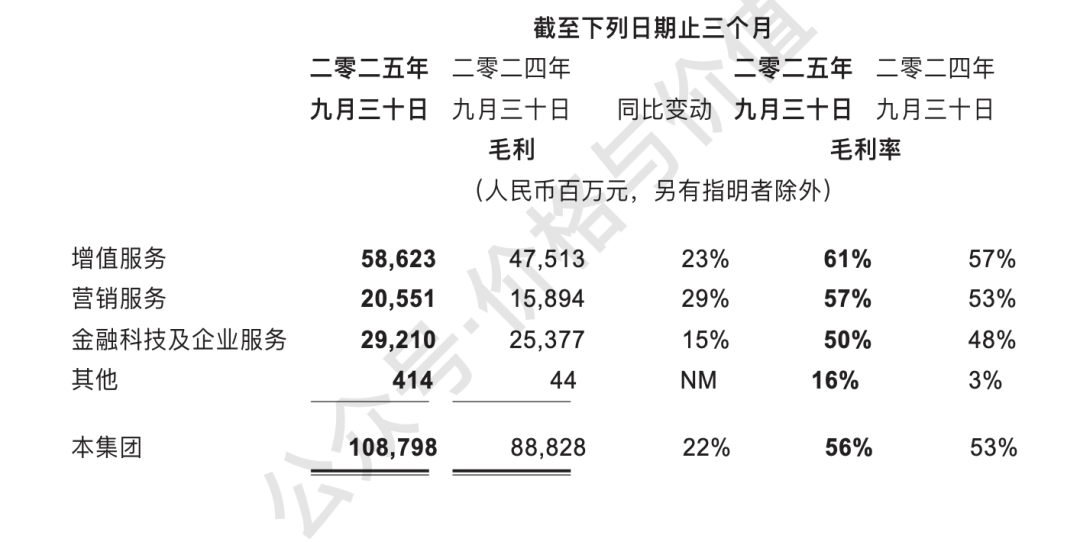 增值服务的收入同比增长16%至959亿元;毛利同比增长23%至586亿元。由于若干自研高毛利率游戏的贡献增加,增值服务的毛利率由去年同期的57%提升至61%。