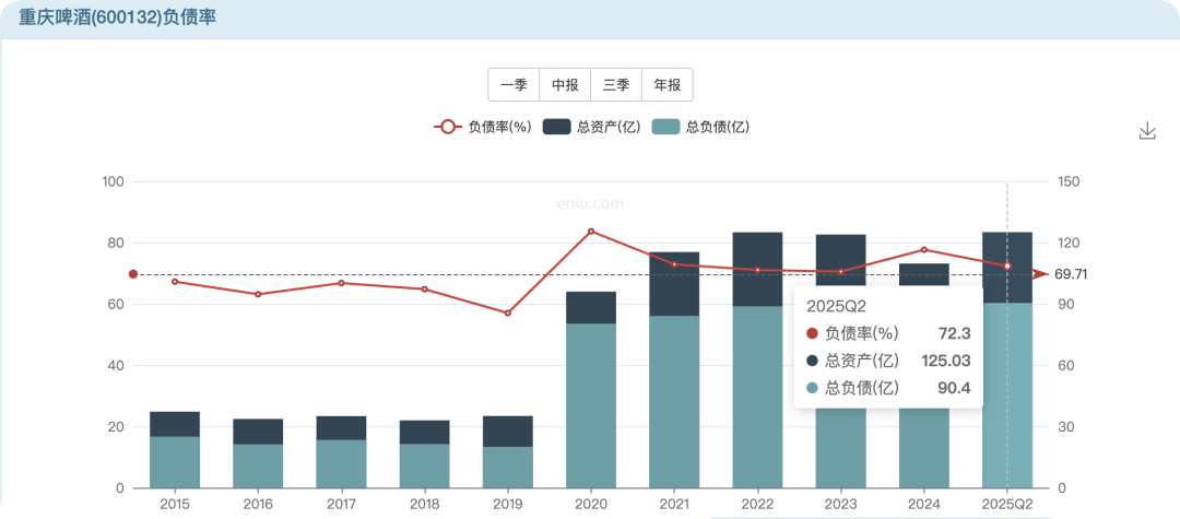2020年嘉士伯资产注入后,重庆啤酒总资产大幅增加,但净资产增长有限,导致权益乘数激增。2025年6月30日,重庆啤酒的负债率约72.30%,权益乘数约为3.61倍(1÷(1-72.30%))。