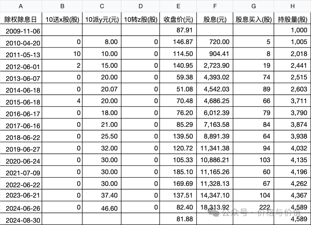 股息买入数量=四舍五入(本期F÷本期E)。例如2011年5月13日的股息买入数量=904.41÷114.50≈8(股)。 - H列