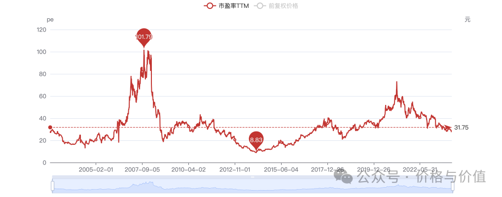 虽然贵州茅台的动态市盈率在8.83~101.79之间随机波动,但不能阻止企业的净利润从3.77亿增长至747.34亿,年化增长率28.64%