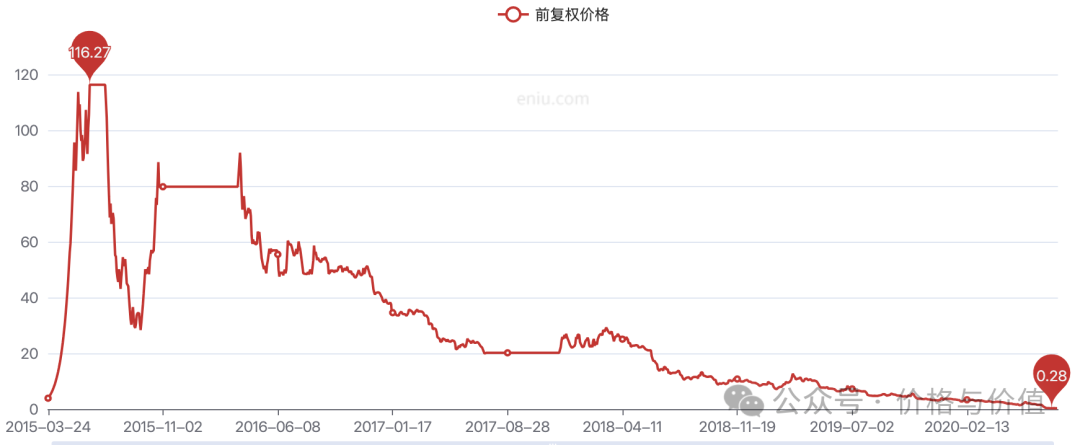 暴风影音,短短两个月的时间股价就上涨到上市发行价格的30倍,达到历史高点116.27元(前复权)。然后由于企业价值不断减少,不足以支撑市场价格,市场价格开始“钝刀子割肉”般地稳步下跌,逐步向企业价值靠拢。五年后,以0.28元的价格黯然退市,与最高点相比下降99.76%。