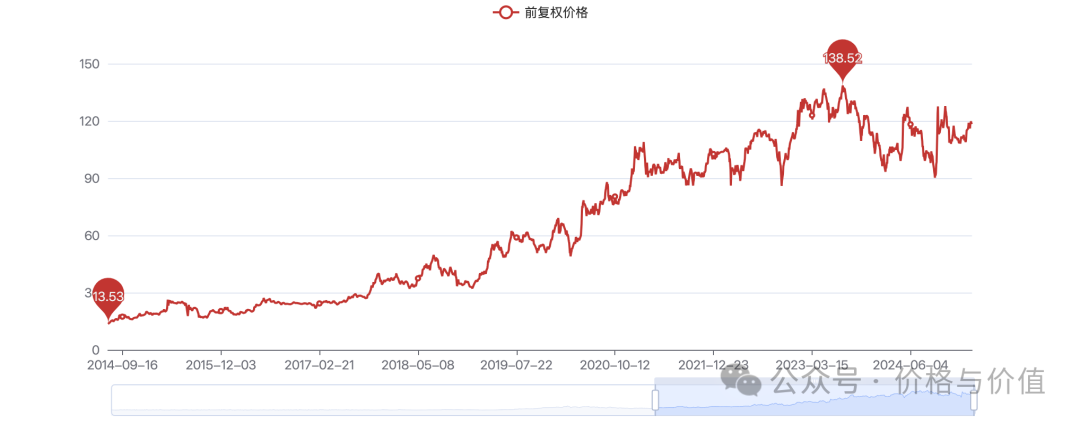 跟暴风影音类似的股票不胜枚举,哪一支到最后不是一地鸡毛?反之,如果企业价值不断增加,那么市场价格自然自然地跟着水涨船高。古井贡B的前复权价格从2014年的十几港币上涨到目前的一百多港币,根本原因是古井贡酒的净利润从2014年的5.97亿增长到2024年的50亿以上。