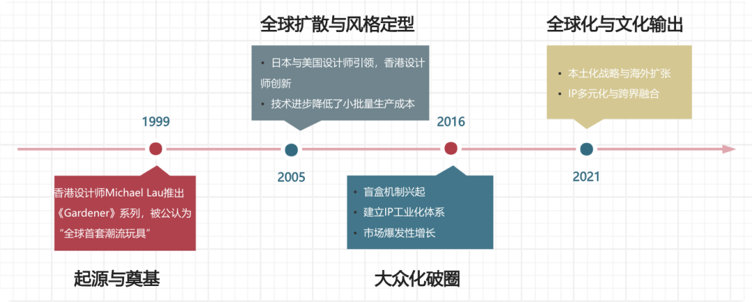 - 全球化与文化输出期(2021–至今):各大厂商一边实施本土化战略,一进行边海外扩张。与此同时,潮流玩具的IP来源拓展至影视、游戏、名人等领域,并与数字潮玩(NFT)等新技术进行跨界融合。