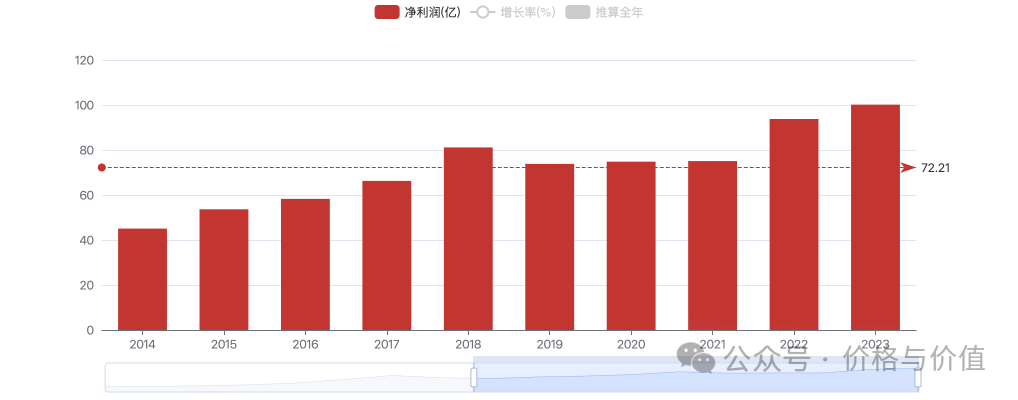 洋河股份2014~2023年年均净利润72.21亿元,合理市盈率为20倍。于是: