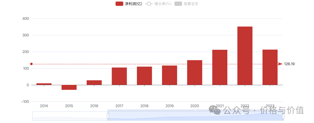 陕西煤业2014~2023年年均净利润126.19亿元,并将其打八折视为自由现金流,合理市盈率为20倍。于是: