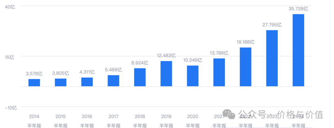2015~2024年间的半年报,归母净利润从3.58亿元,增长至35.73亿元,年化增长率约为25.87%,仅2020年同比减少17.89%。