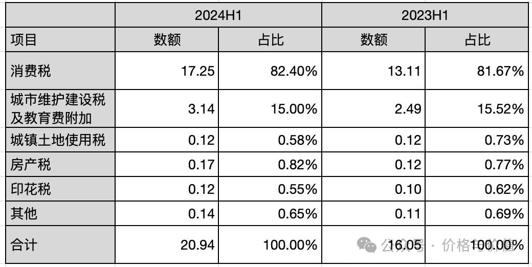 税金及附加20.94亿元,同比增长31.58%,占营业总成本的23.71%。税金及附加中最主要的是消费税、城市维护建设税及教育费附加,占比分别是82.40%、15.00%。