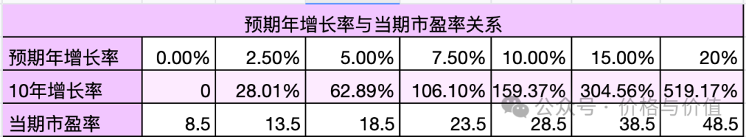 是不是眼熟?其实跟企业市值的计算公式类似:市值 = 利润 × 市盈率。不仅可以根据预期年增长率计算出企业的内在价值,也可以反过来确定当期市场价格所代表的预期年增长率。