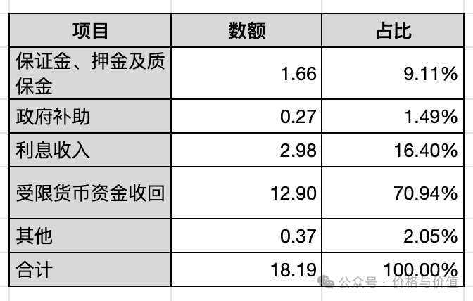 收到其他与经营活动有关的现金合计18.19亿元,其中最主要的是“受限货币资金”、“利息”、“保证金、押金及质保金”,占比分别是70.94%、16.40%、9.11%。