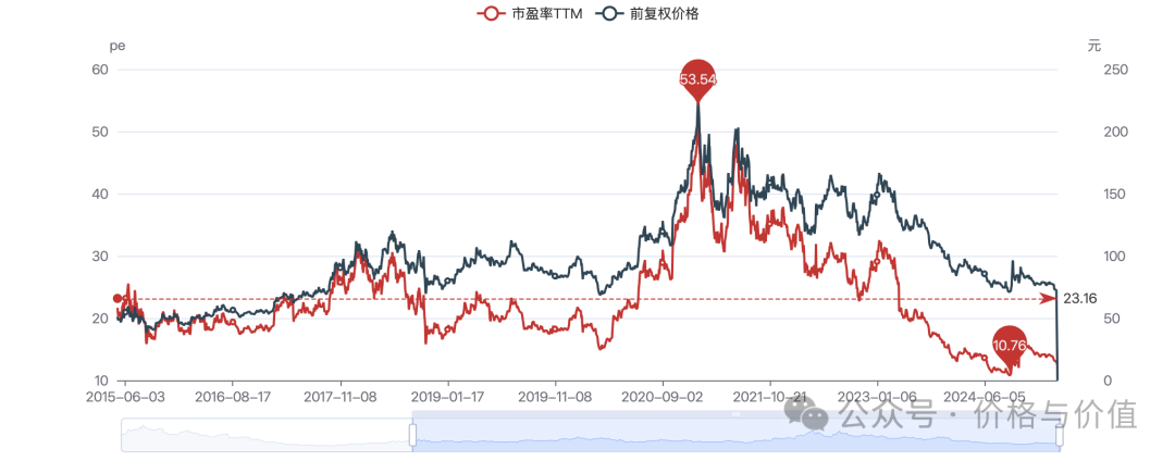 自从洋河股份2006年上市以来,净利润越来越呈现周期性波动——2012年第一个峰值,2018年第二个峰值,2023年第三个峰值,所以洋河股份已经不再是“成长股”,而是沦落为“周期股”。因此,对洋河股份的投资,我们就不能再追求净利润增长带来的内在价值提升,而是只赚取估值水平(市盈率)升高带来的价差。