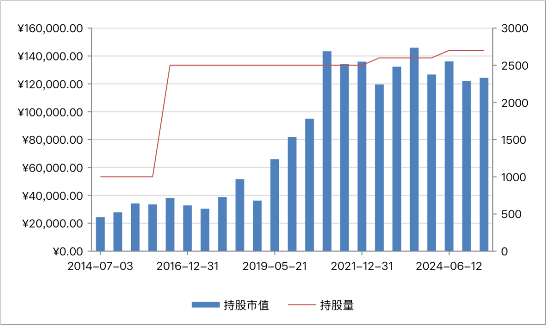 今世缘于2014年7月13日在上交所上市。假设上市当日我们以24.38元的收盘价买入1000股,并持有至2025年5月20日,期间股息再投。持股市值变动明细如下: