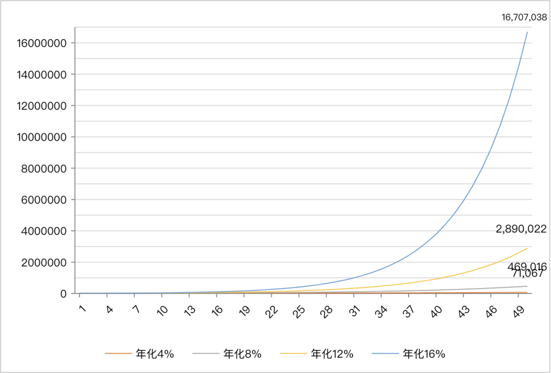 举例来说,假设初始本金1万元,投资30年,年化收益率8%的情况下最终资产约为10.06万元;当年化收益率提升至12%时,最终资产跃升至约29.96万元。仅仅是4个百分点的差距,在30年间就产生了近20万元的绝对差异。更恐怖的是,如果把时间拉长到50年,二者的绝对差值将达到242万元。