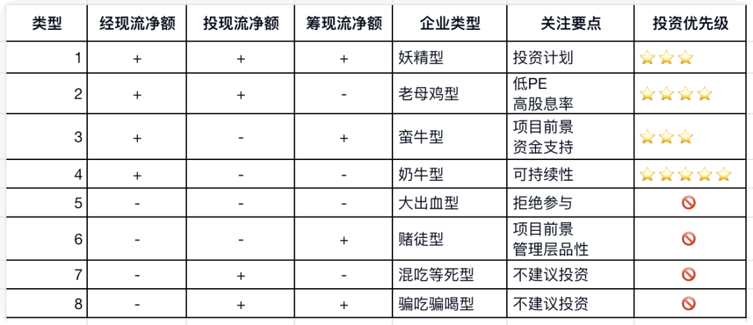 如果以“+”表示现金流入,以“-”表示现金流出,那么企业的现金流情况就有了八种不同的组合。投资就是比较,“奶牛型”企业是我们投资的首选。各个企业类型的关注要点及投资优先级详情如下: