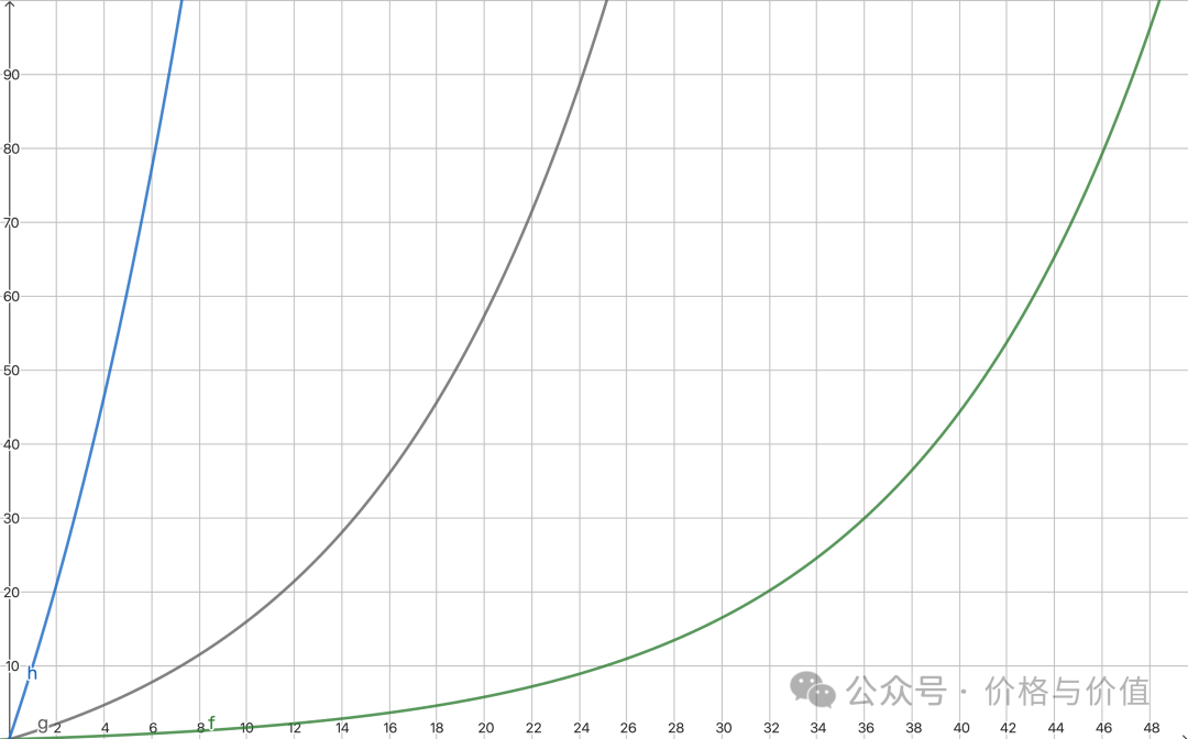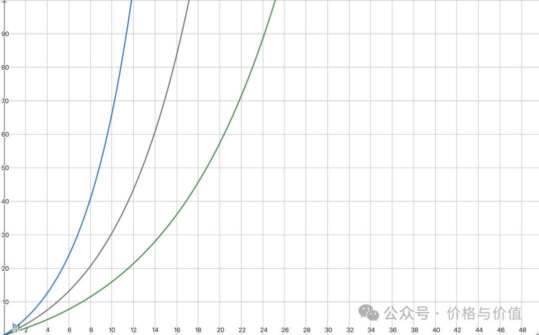 如果年化收益率为10%,在本金分别是1万、10万、100万的情况下,则收益达到100万需要的时间依次约是48年、25年、7年(横轴:年数;纵轴:收益)。