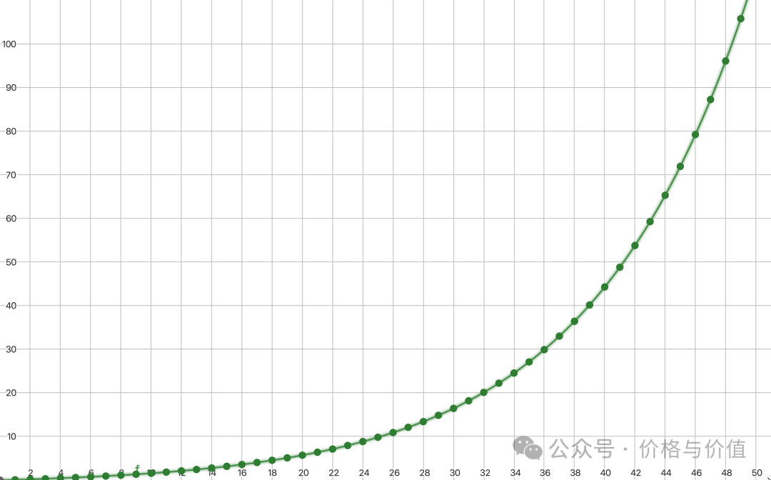 如果本金为1万,在年化收益率是10%的情况下,则收益从0到10万需要大约25年,从10万到20万需要大约7年,从20万到30万只需要大约4年······(横轴:年数;纵轴:收益)。
