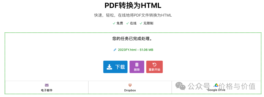 点击「下载」按钮保存转换后的HTML文件,当然也支持邮件发送、保存至Dropbox或Google Drive。文件在处理后一小时内从处理服务器上自动删除,尽快下载或保存。