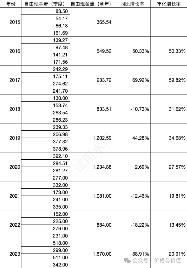 通过统计腾讯控股2015~2023年的自由现金流(单位:亿元)数据,最近8年的年化增长率为20.91%,于是我们保守估计未来5年的自由现金流增长率为15%。