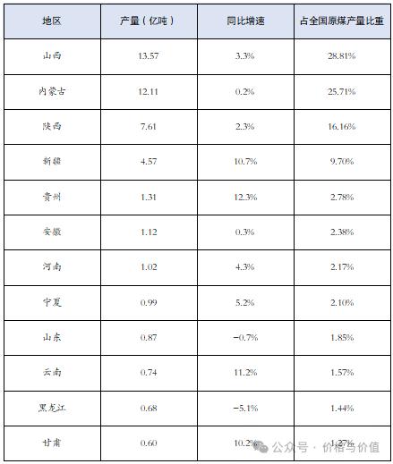 2023年,山西、内蒙古、陕西及新疆的原煤产量(规模以上企业)分别为13.57亿吨、12.11亿吨、7.61亿吨、4.57亿吨,合计占全国总产量的81.27%。
