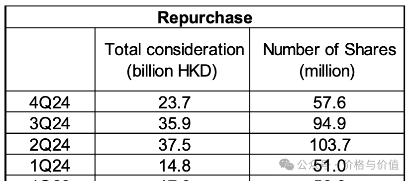 腾讯控股2024年共回购注销3.07亿股,总金额达1120亿港元,回购均价约为364.82港元。股份总数减少2.63亿股,下降至92.2亿股。换句话说,按照2023年净利润计算,每股价值增加了2.85%(94.83/92.2-1)。