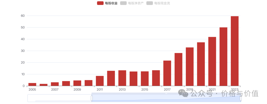 贵州茅台,完全依赖净利润的推动,就把EPS从2005年的2.37元增至2023年的59.49元,年化增长19.37%。可不要小瞧这将近20%的增长率,在复利的作用下,EPS在18年里翻了25倍。