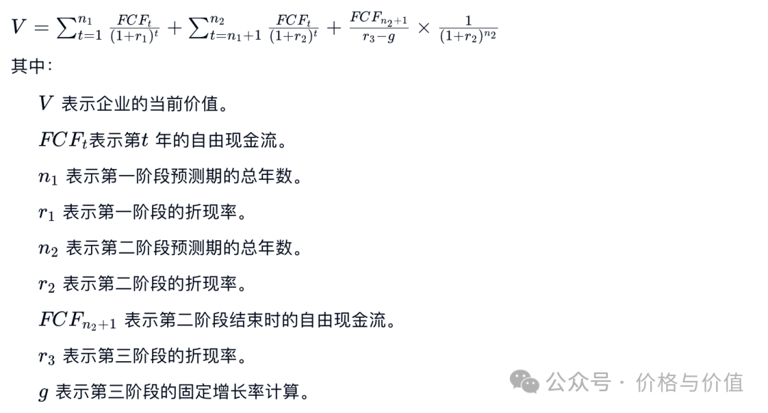 由于既不能知道企业的存续期有多久,又不能知道未来每年的自由现金流,所以在实际应用中,通常使用自由现金流折现估值法的简化版本:两段式和三段式。