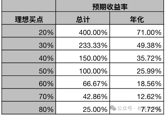 再次,留有合理的预期收益。在合理估值的50%位置买入,如果三年后企业处于合理估值(能不能到达只是市场先生的出价,与企业价值无关),就相当于三年翻一倍,折合年化收益率25.99%(2^(1/3)-1),既接近唐朝设定的年化收益率25%的期望值也便于快速口算。不同理想买点与预期收益率的对应关系如下所示。