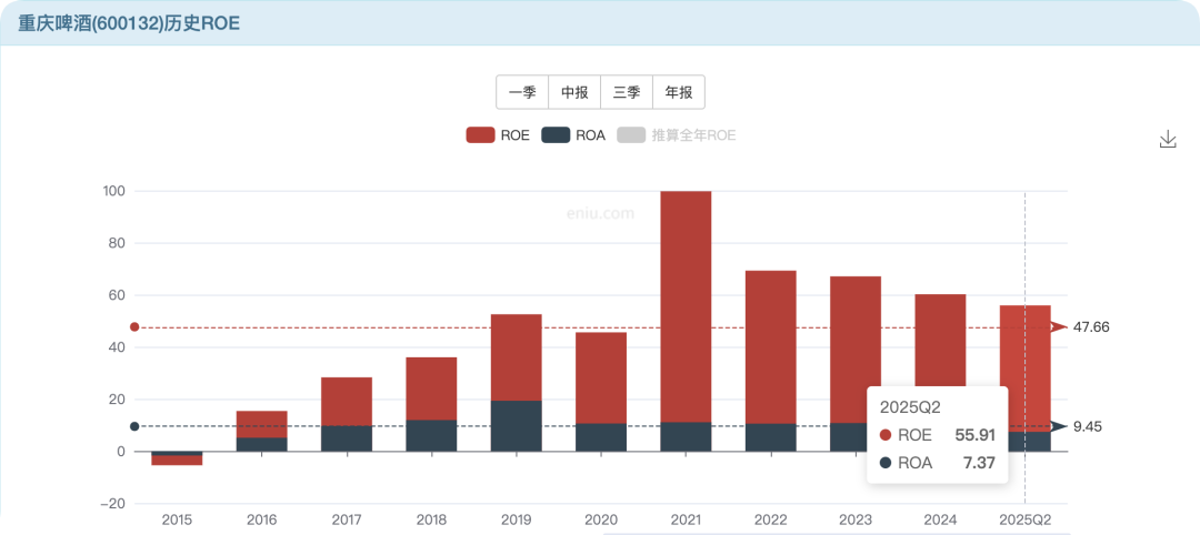 或许有朋友会有疑问,资产注入前,重庆啤酒的负债率一直都不低于50%,为什么ROE却没有现在这么高的离谱?
