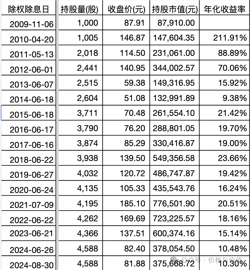 如果我们在上市当日(2009年11月6日)以87.91元的收盘价买入1000股洋河,一直呆坐不动,并且期间的分红再投入,那么截止到8月30日的收益率会怎么样呢?