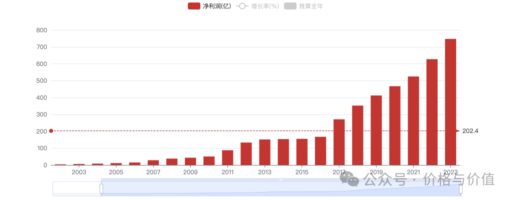 虽然贵州茅台的动态市盈率在8.83~101.79之间随机波动,但不能阻止企业的净利润从3.77亿增长至747.34亿,年化增长率28.64%