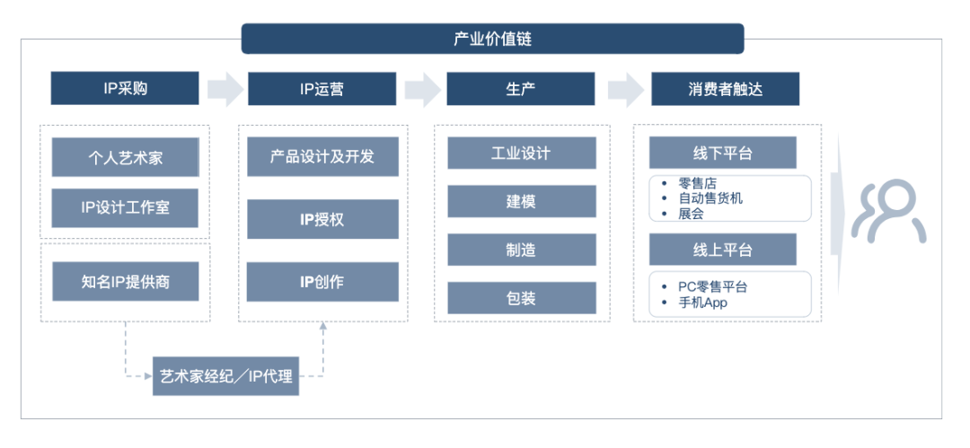 - IP采购:潮流玩具公司的IP来源于艺术家/工作室、IP提供商和自创。