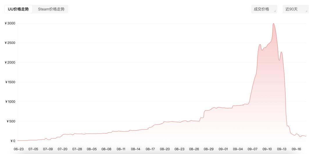 然而进入9月后,“黑蛋”贴纸的价格突然迎来疯狂暴涨,月内涨幅近十倍。更是在9月12日达到3000多元的历史高点。随后的剧情,大家可能也都猜到了——疯狂暴跌,三天下跌了90%多!