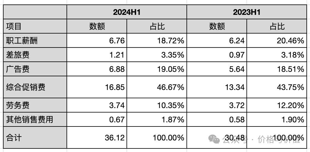 销售费用36.12亿元,同比增长18.50%,占营业总成本的40.90%。销售费用中最主要的是综合促销费、广告费、职工薪酬,占比分别是46.67%、19.05%、18.72%。