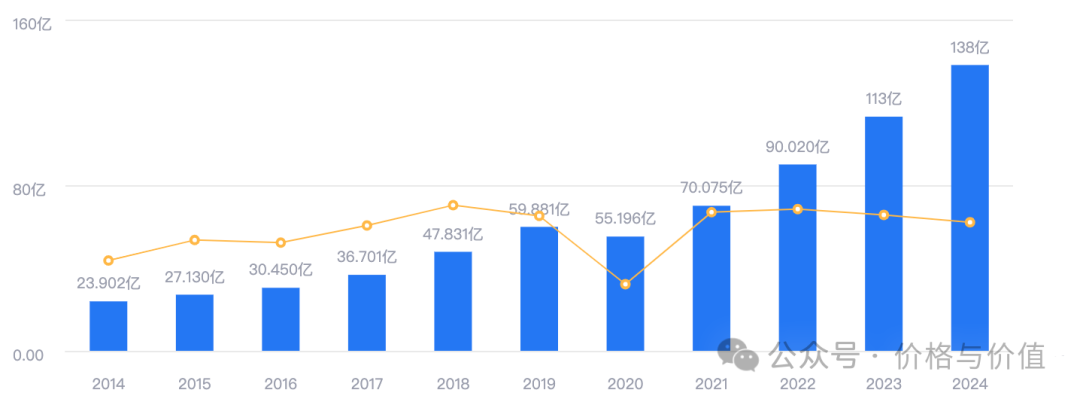 2015~2024年间的半年报,营业收入从23.90亿元,增长至138.06亿元,年化增长率约为19.17%,仅2020年同比减少7.82%。