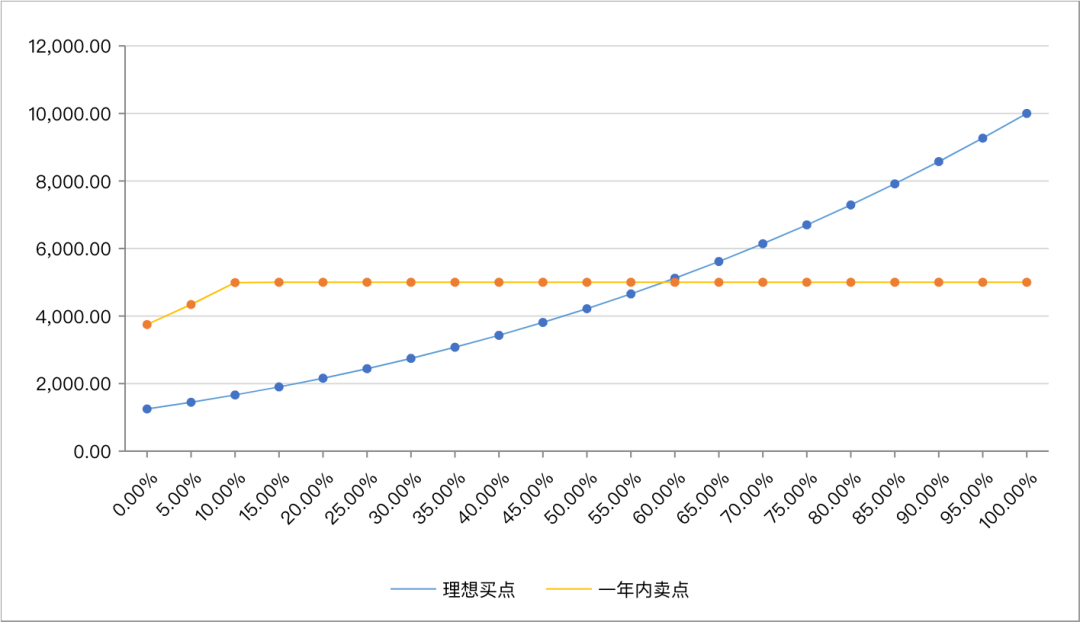 假设某企业当年净利润100亿元,合理市盈率为25倍,未来三年年化增长率为g,则随着g的增加,理想买点逐渐靠近一年内卖点,直至某个阈值后反超一年内卖点。