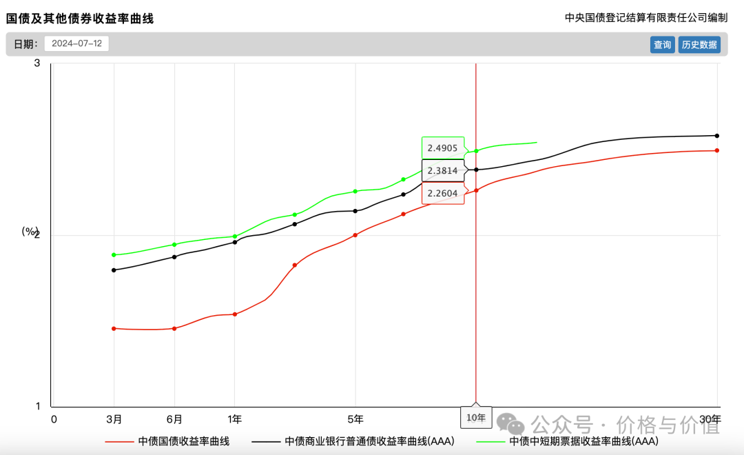 唐朝选择的无风险收益率标准是十年期国债与AAA级企业债券利率二者的较大值。2024年7月12日的国债及其他债券收益率曲线如下: