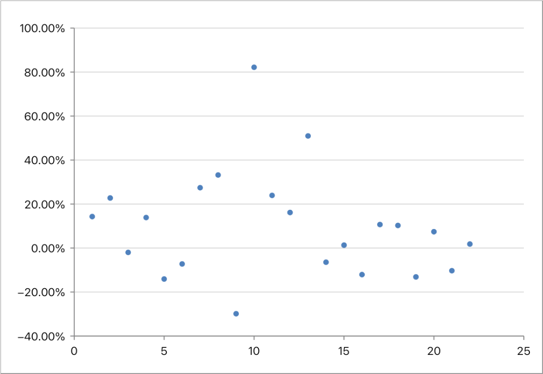 82.19%;回撤超过40%的次数为0次,最大回撤为-29.86%。 - 以横坐标中心值13为界,前半段时间内收益的振幅较大,后半段时间内收益集中在-20%~20%区间。