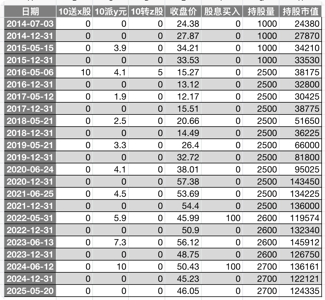 今世缘于2014年7月13日在上交所上市。假设上市当日我们以24.38元的收盘价买入1000股,并持有至2025年5月20日,期间股息再投。持股市值变动明细如下: