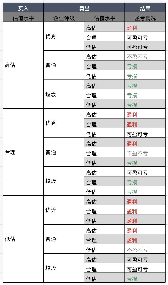 如果我们将上市公司划分为优秀、普通和垃圾三大评级,同时将它们的市场定价划分为高估、合理和低估三种状态,再结合买入和卖出的不同时机,理论上可以组合出81种不同的投资策略。